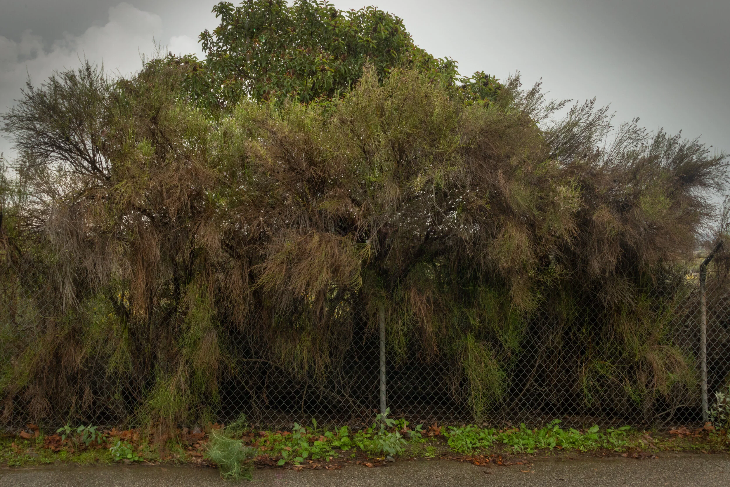 Fences are a geometric imposition, more suggestive than definite. They are an enforcement on nature, but they almost disappear as if they were only thoughts or lines on a map. Plants observe and envelope them. They bring vertical planes into our view of the landscape. Sometimes shimmering, diamond shapes stretched in steel mesh, that interrupt the visual flow of the land. Fences are a graphic expression of the need for humans to impose their will upon nature.